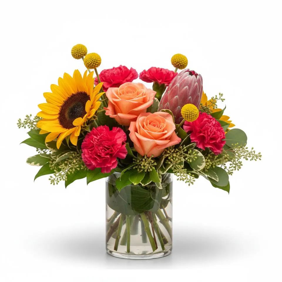 Step into a 'Garden of Joy' with this vibrant bouquet! Featuring bright sunflowers, elegant roses, cheerful carnations, and exotic Pink Ice Protea, it's a celebration of nature's beauty. Accented with lush greenery, this arrangement is sure to bring a smile to anyone's face.
